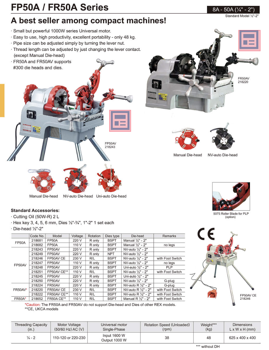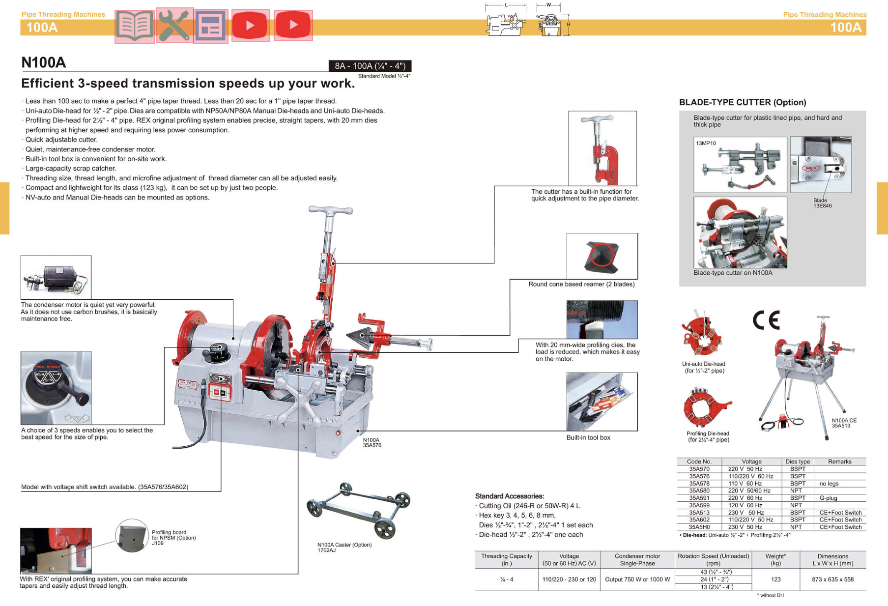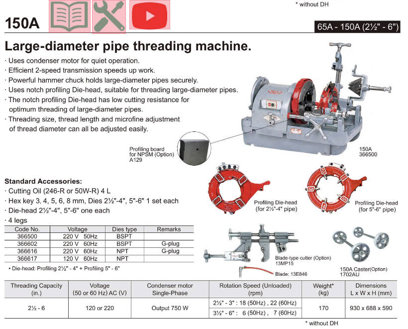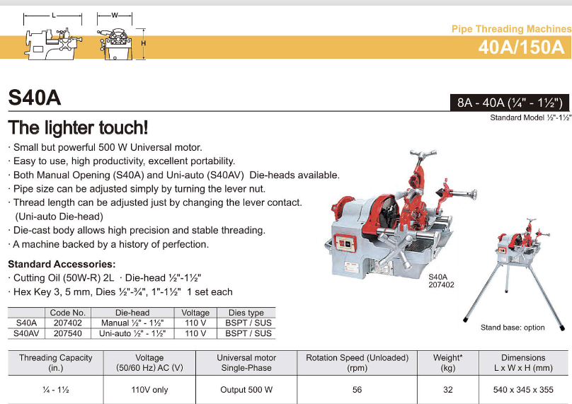 Threading Capacity (in.) | Voltage (50/60 Hz) AC (V) | Universal Motor Single-Phase | Rotation Speed (Unloaded) (rpm) | Weight (kg) | Dimensions L x W x H (mm) |