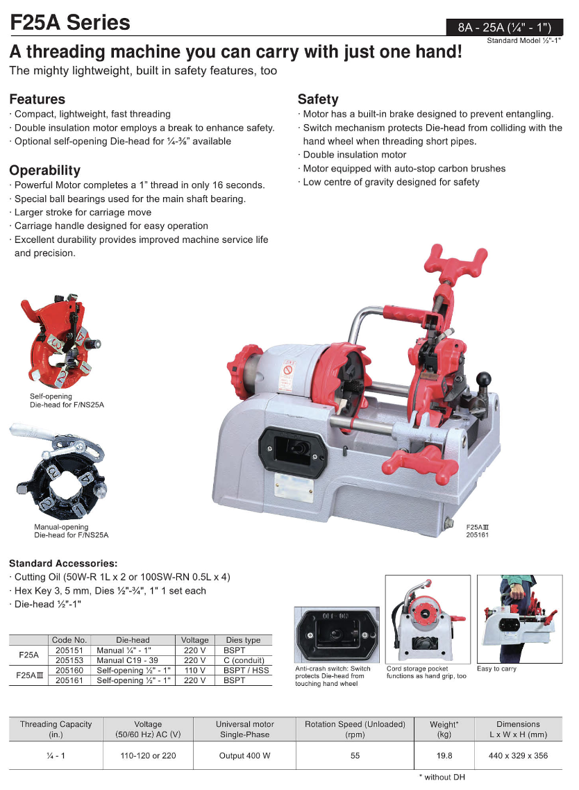 - Powerful motor completes a 1" thread in only 16 seconds.
